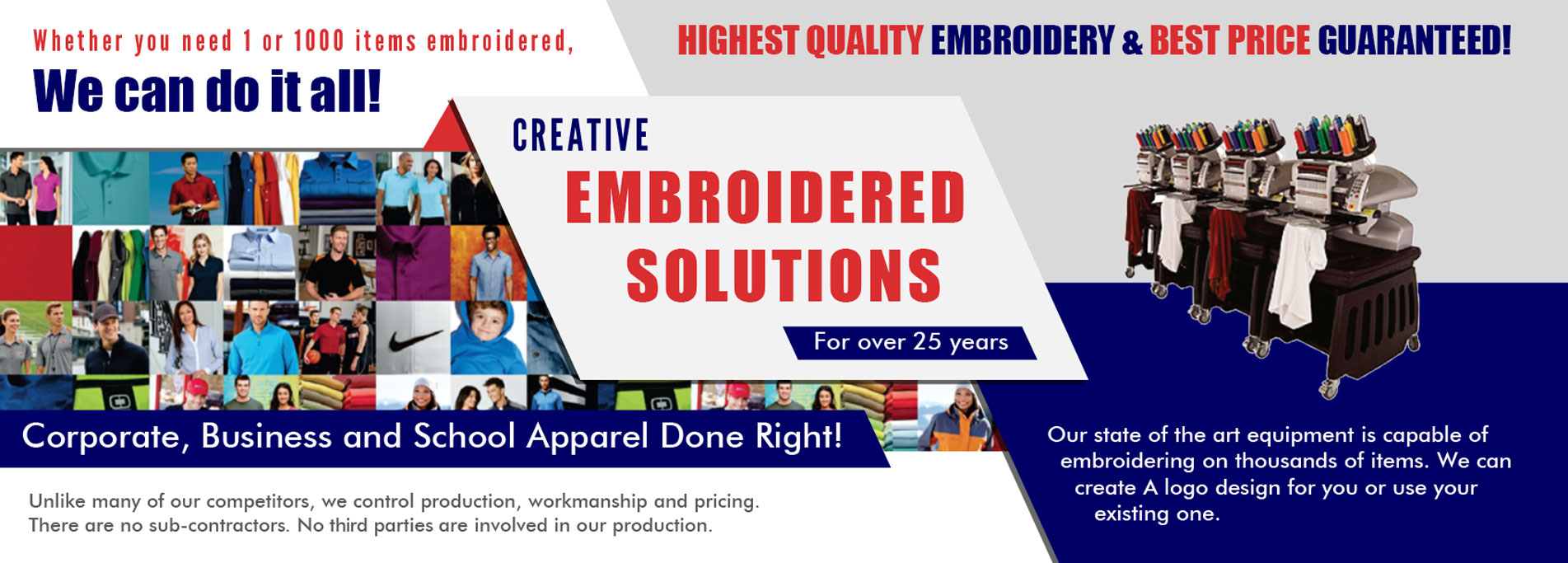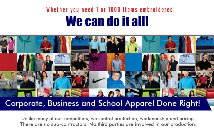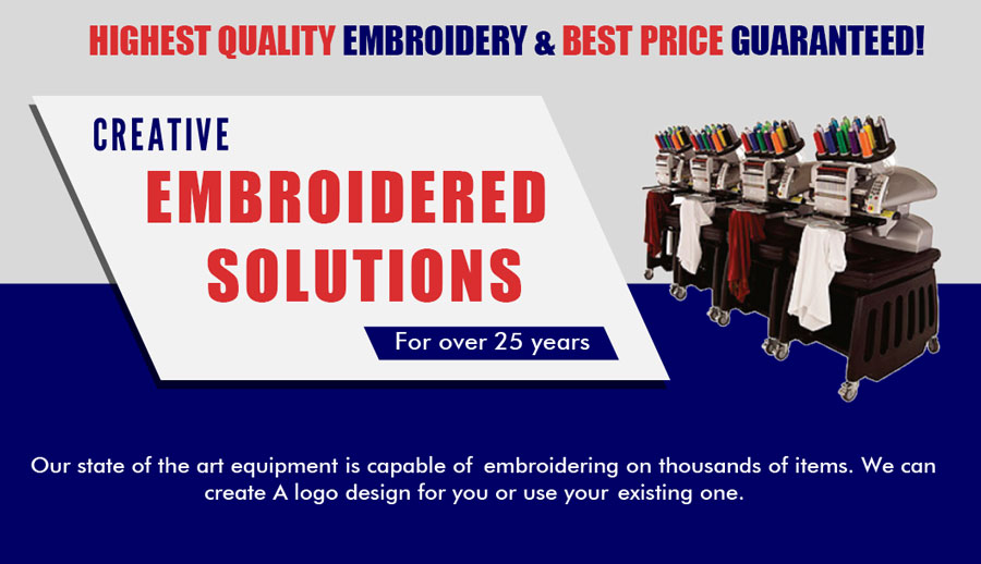 Embroidery Experts Your One Stop Shop. All Designs Done in House. Thousands of Ideas. Order Your Apparel Today WE CAN USE YOUR EXISTING LOGO, OR CREATE ONE FOR YOU! Corporate Wearables Team and School Uniforms Big or Small Businesses